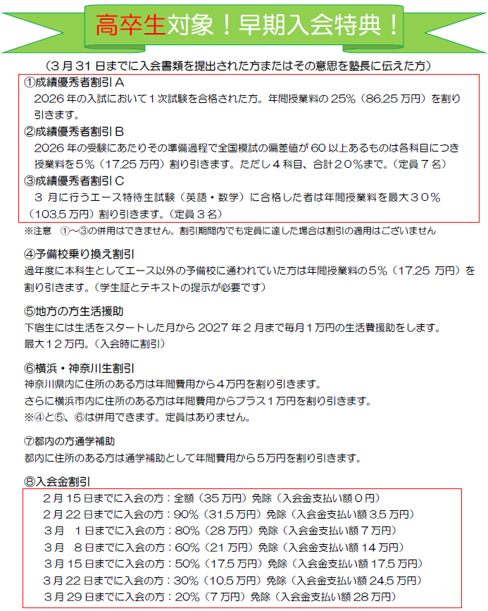 エースメディカルみなとみらい2026-27年度の年間授業料(受験科目全て)は高卒本科生:¥3,450,000(割引前)です。